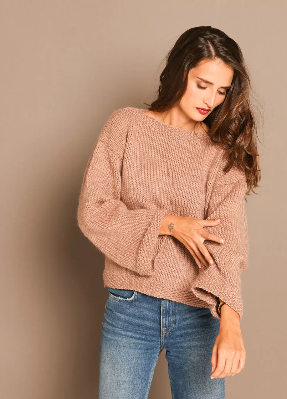 This project is sure to bring a smile to your face. This bateau neckline sweater is easy to knit and easy to wear! This simple project is flat knitted, combining stockinette stitch and seed stitch.Putting it on will be like giving yourself a little hug.