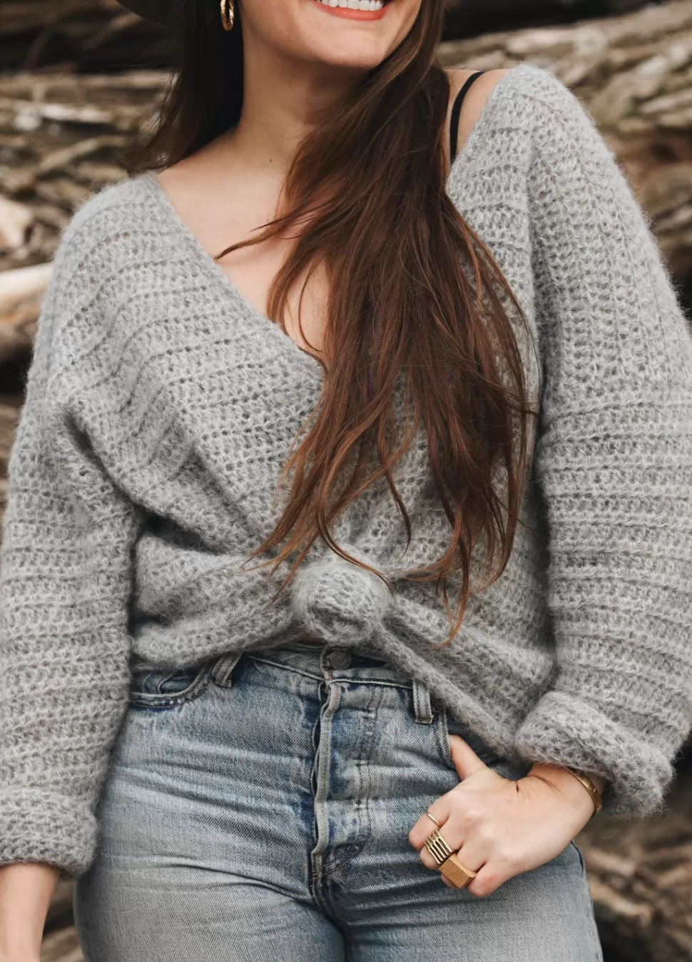 The Gossamer Pullover designed by Alexandra Tavel is worked in two strands of Touch Me Mohair. This V-neck sweater is an easy level crochet project worked in one piece, which means minimal seaming! The front and back are worked flat, once the body is finished the sleeves are worked in the round.