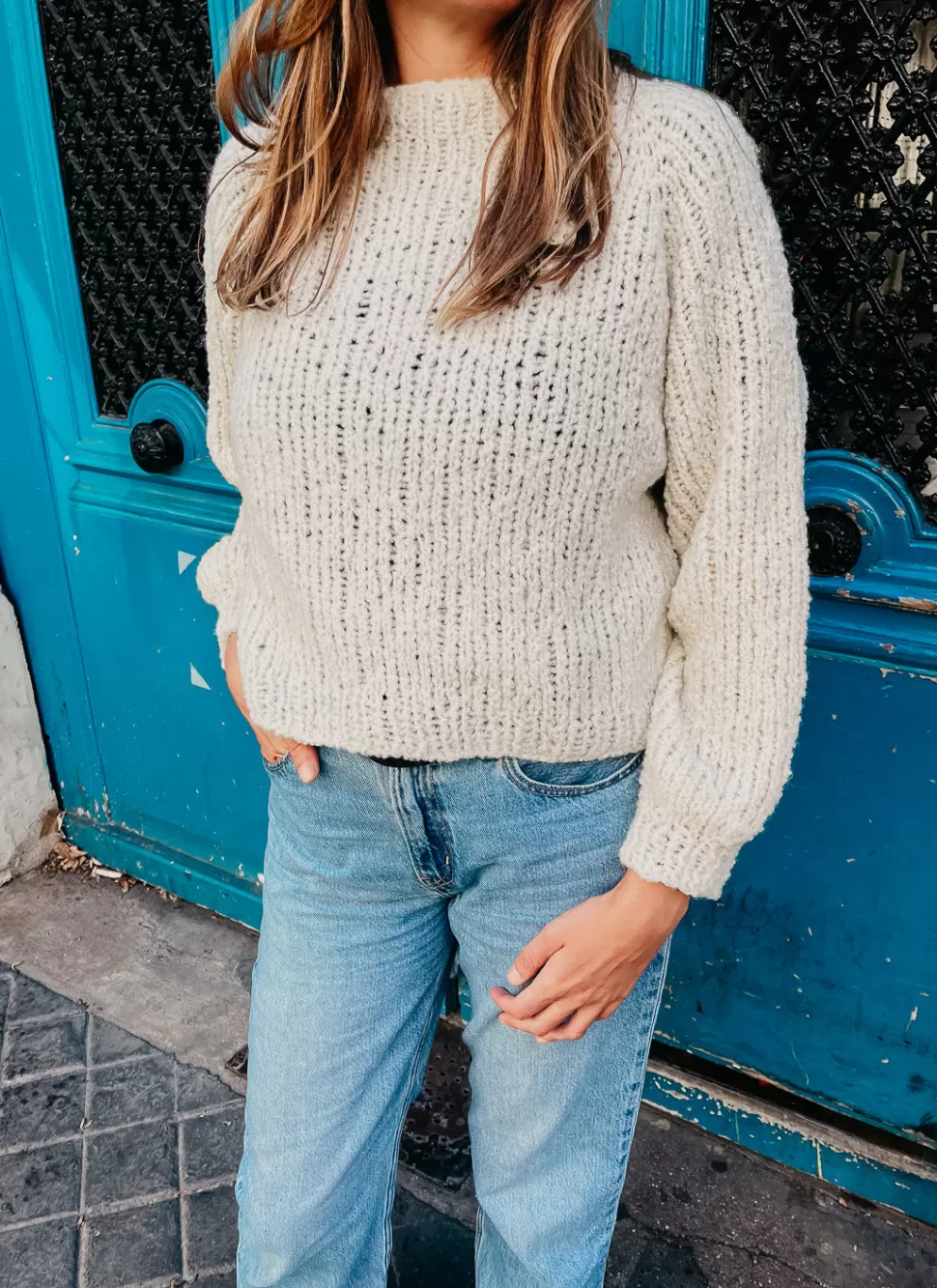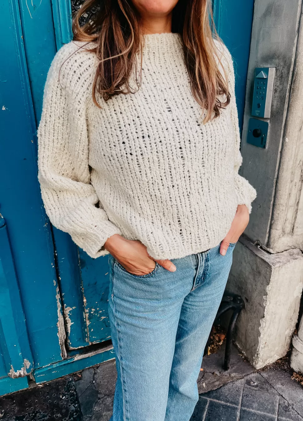 This intermediate level knitting project will become your favorite handmade sweater when you need an extra layer of coziness. This project is worked in one piece in the round from the top down. To do this, you’ll start at the neck, working the body and the sleeves together in the round until you reach the armholes. Once you work the length of the armholes, you’ll work each part separately in the round, first the body, leaving the sleeves on hold, then each one of the sleeves.