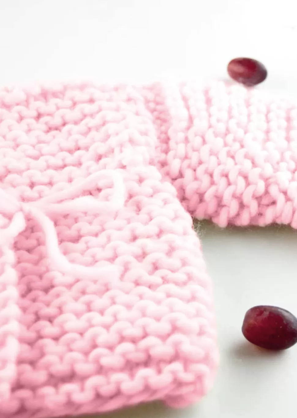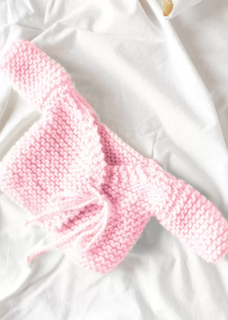 This tiny project is an easy and quick knit and the finished project is the perfect gift for a newborn! This project is knitted in several pieces which are then seamed together: back, left front, right front, and sleeves.